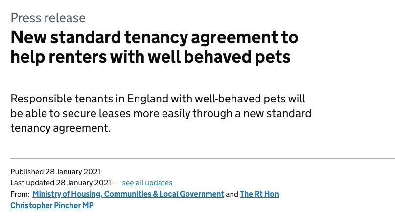 From today (28.01.2021) the New Standard or 'Model' Tenancy Agreement that will replace the old Agreement (this template is set by Government and landlords are supposed to issue these as their rules for the property, and give a copy to the tenant, signed by you and them) ‘automatically’ will allow pets, and tenants as well as tenants-to-be still have to apply in writing BUT if the landlord does not respond in 28 days, then the default is approval as detailed in your new Tenancy Agreement will apply and you could not be evicted for having a dog.